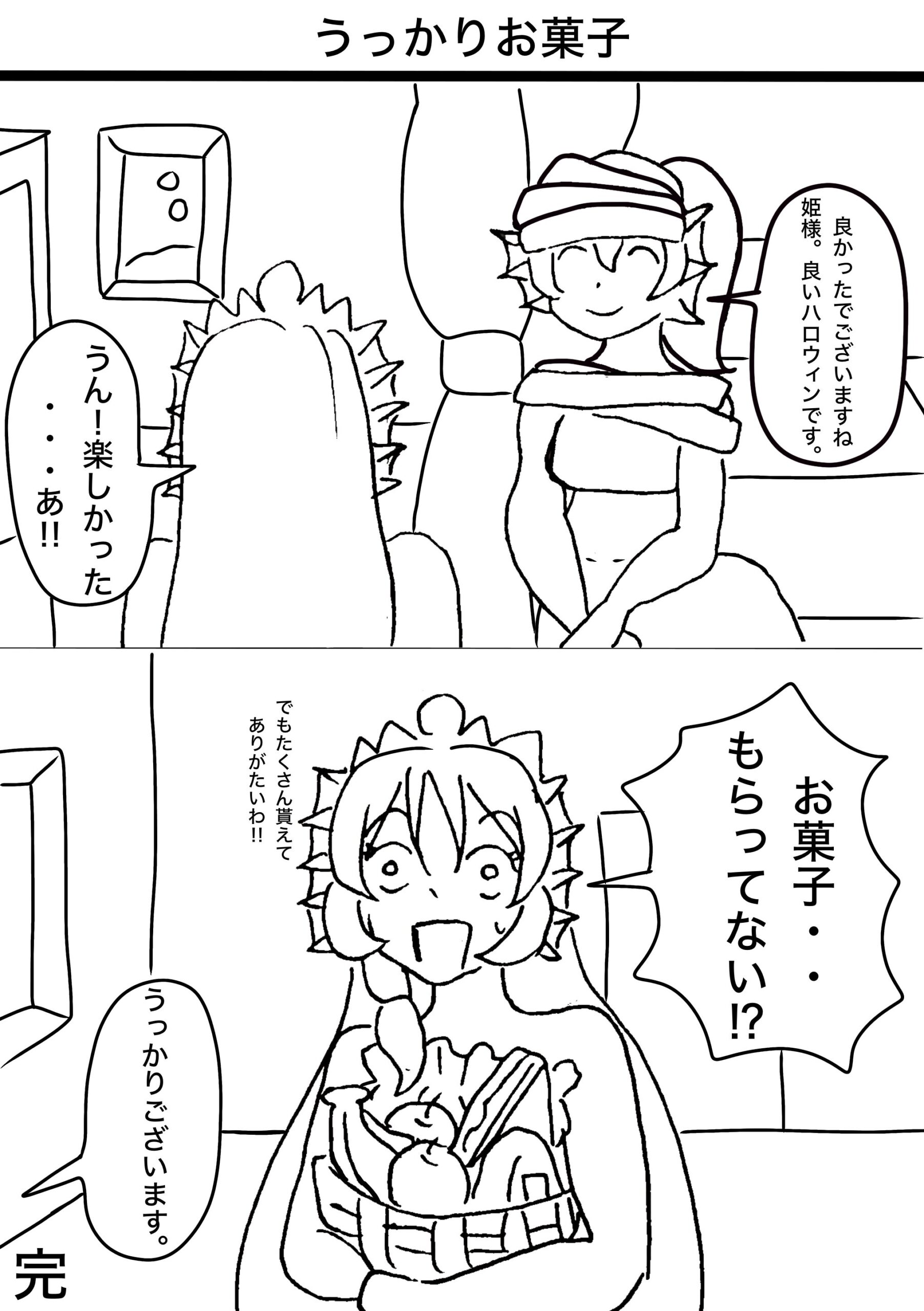 こちらが今回投稿しました新しい作品です。ハロウィンでの短編ネタを描きました。姫様のうっかりと仲間たちのツッコミやノリを楽しんでいただけたらと思います。