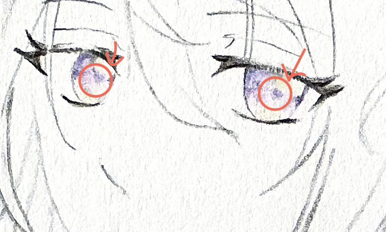 こちらの赤丸部分が薄めです。(瞳孔は濃いめに塗ります)
