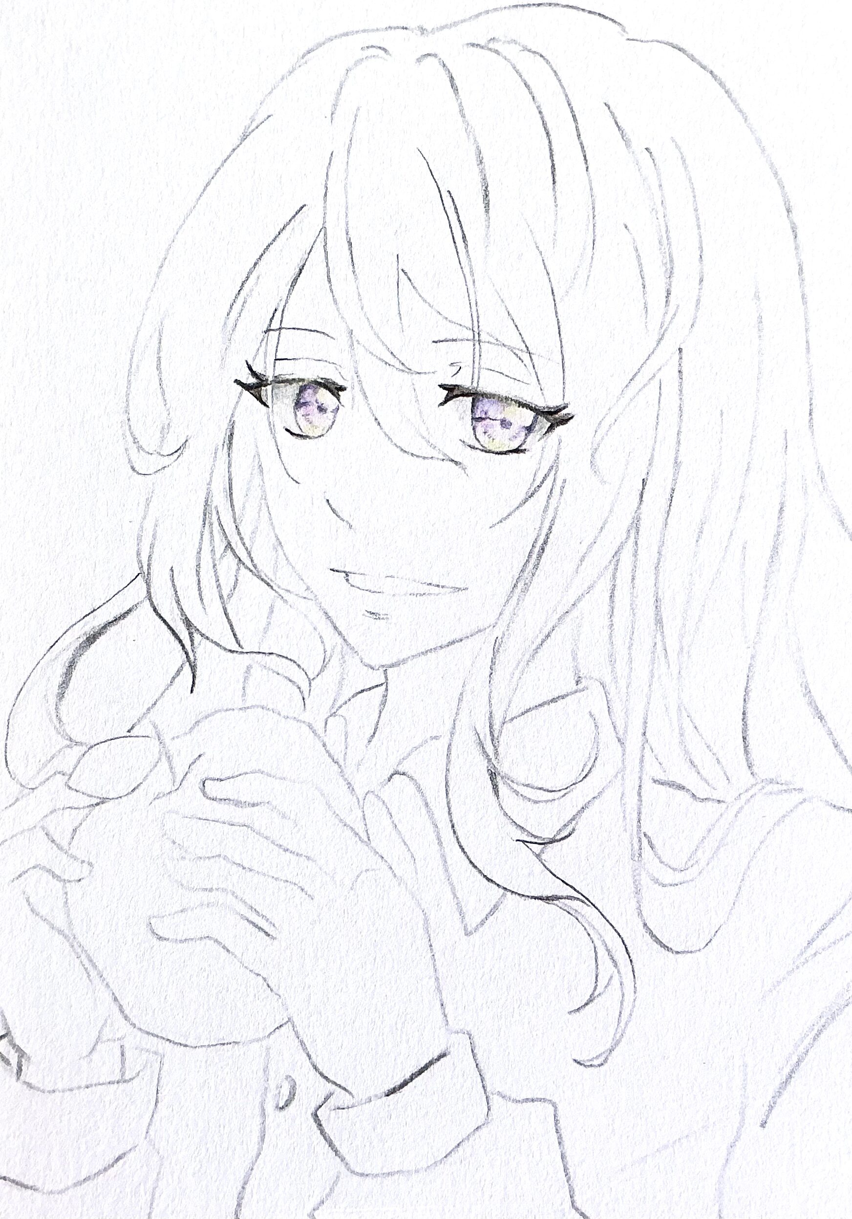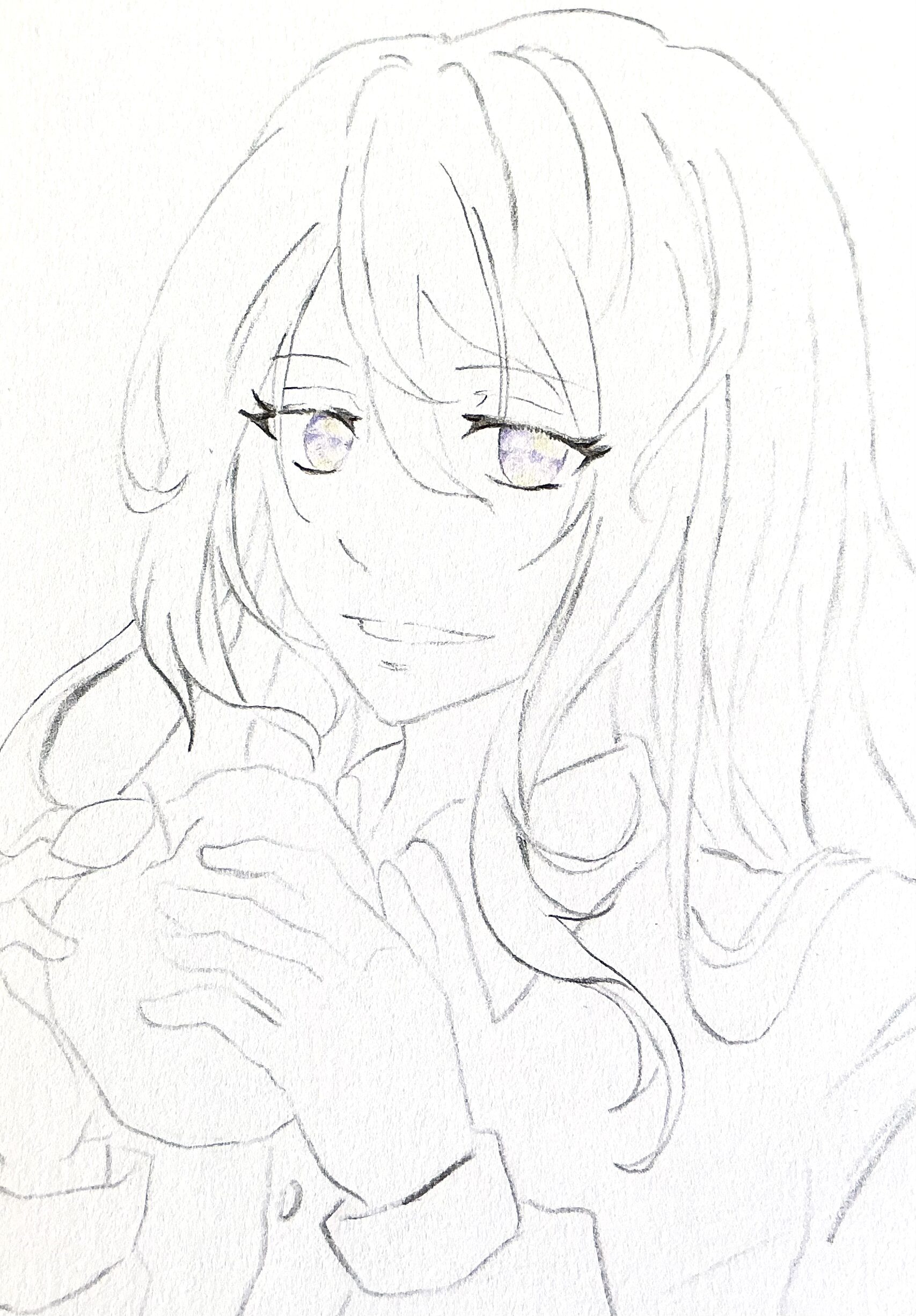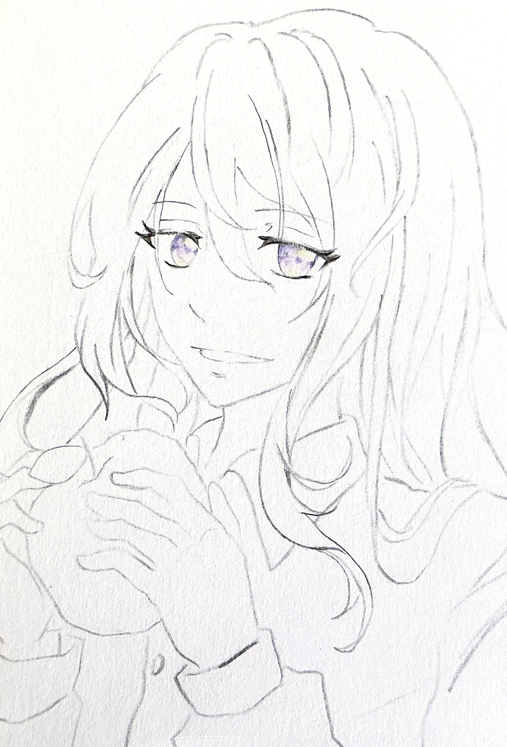 すみれ色で瞳の上部分を塗ります。白いハイライトも入れたいと思ったので塗り残しております。