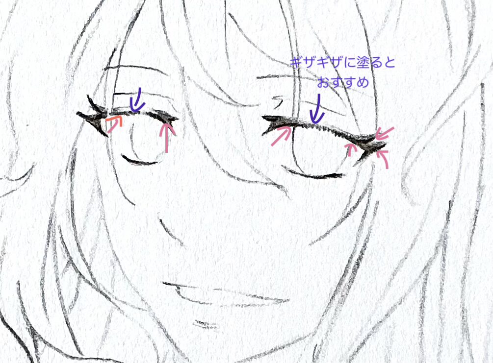 真ん中の下(紫矢印部分)ぐらいをギザギザとしておくと睫毛の表現ができます。