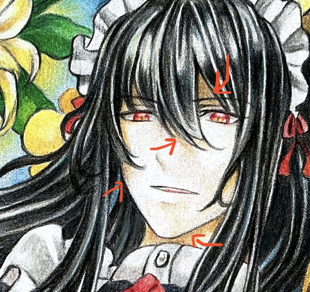 青い矢印が指してる頬のところ、口元などの影も少し塗りました。顔の形はこういった部分にも影が落ちると学び、工夫しております。